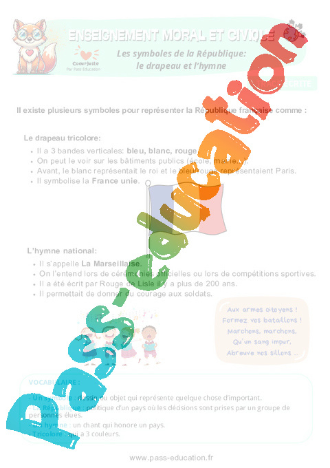Leçon à imprimer – Les symboles de la République: le drapeau et l’hymne : Primaire 1 – EMC Education morale et civique.