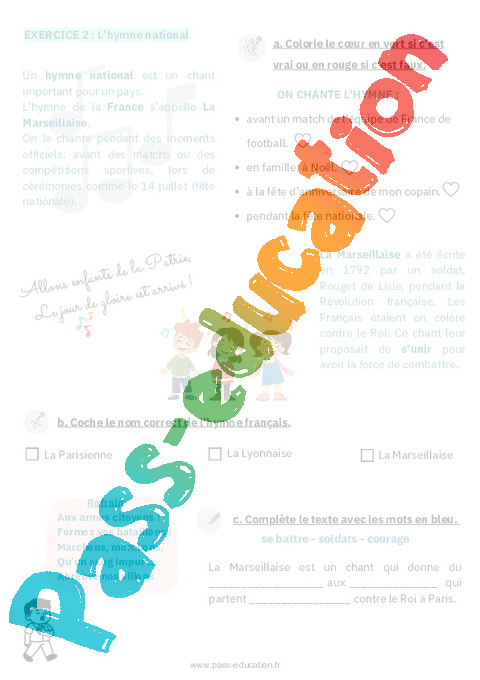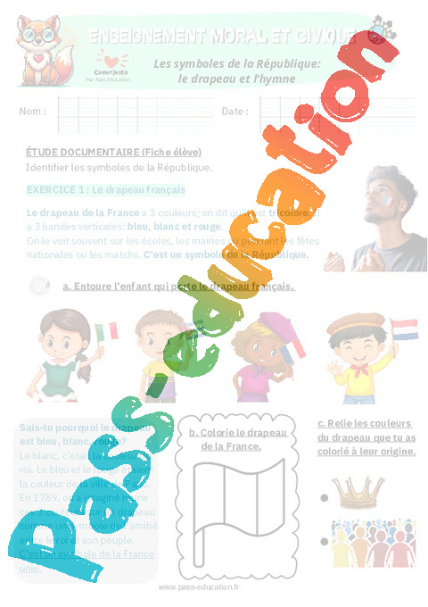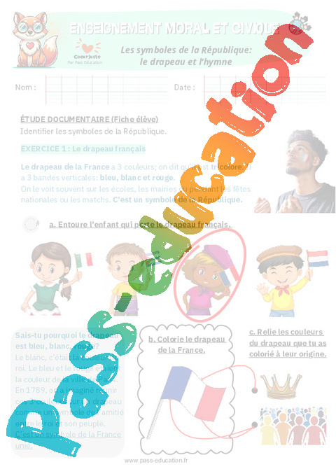 Exercices Les symboles de la République: le drapeau et l’hymne : Primaire 1 – EMC Education morale et civique.