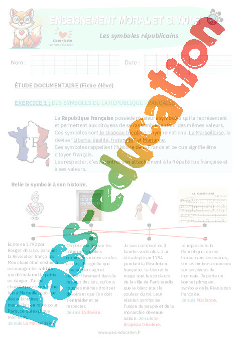 Exercices à imprimer – Les symboles républicains : Primaire 5 – EMC Education morale et civique.