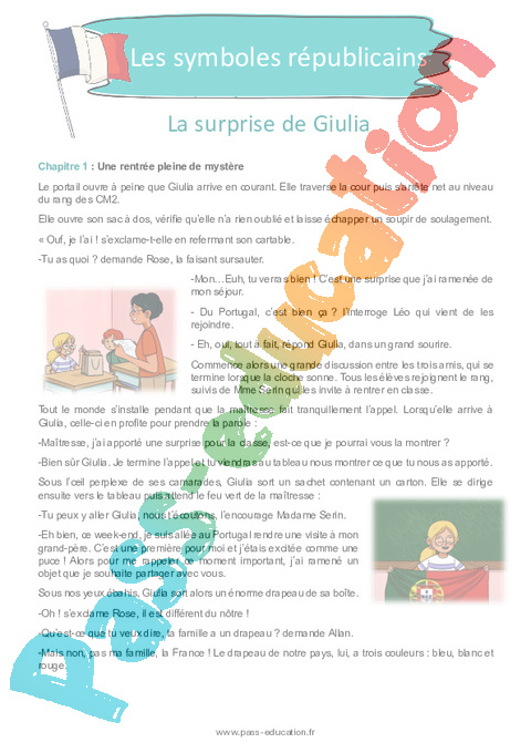 Giulia revient du Portugal avec un drapeau qu’elle veut présenter à sa classe. Cette surprise amène les élèves à comparer les drapeaux français et portugais, puis à évoquer l’Union européenne et les symboles de la République française. La maîtresse conclut la discussion sur le fait que ces symboles représentent les valeurs et l’unité du peuple français.
