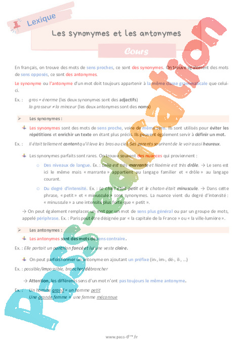 Cours de vocabulaire sur les synonymes et les antonymes en 6ème.