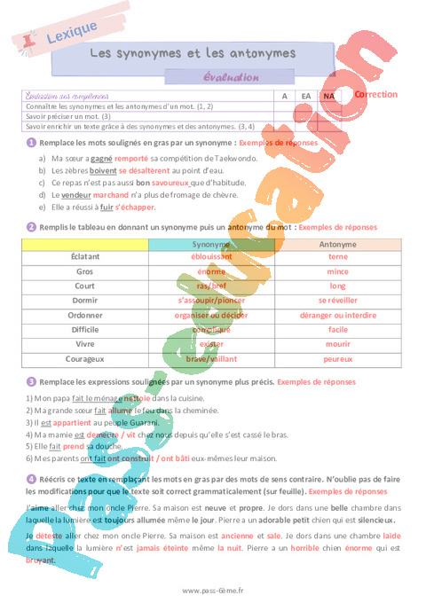 Correction Les synonymes et les antonymes – Evaluation de vocabulaire pour la Primaire 6 pdf
