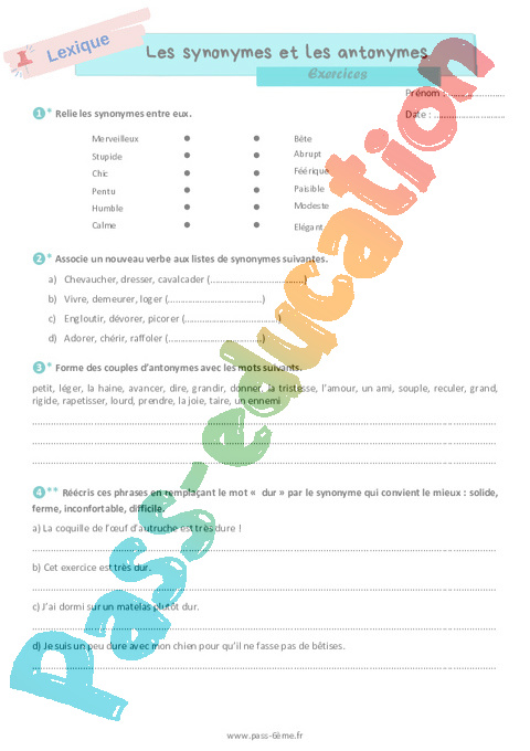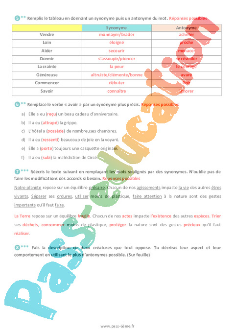Exercices de vocabulaire avec la correction sur les synonymes et les antonymes en 6ème.