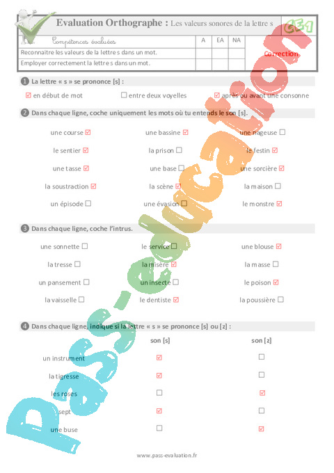 Evaluation Orthographe : Les valeurs sonores de la lettre s