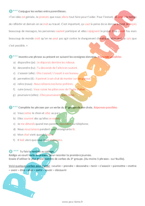 Correction Exercices Les verbes du 3ème groupe au présent de l’indicatif 6ème pdf