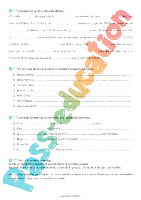 Exercices Les verbes du 3ème groupe au présent de l’indicatif 6ème pdf