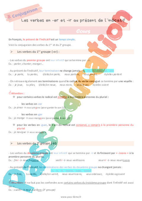 Cours Les verbes en er et les verbes en ir au présent 6ème pdf