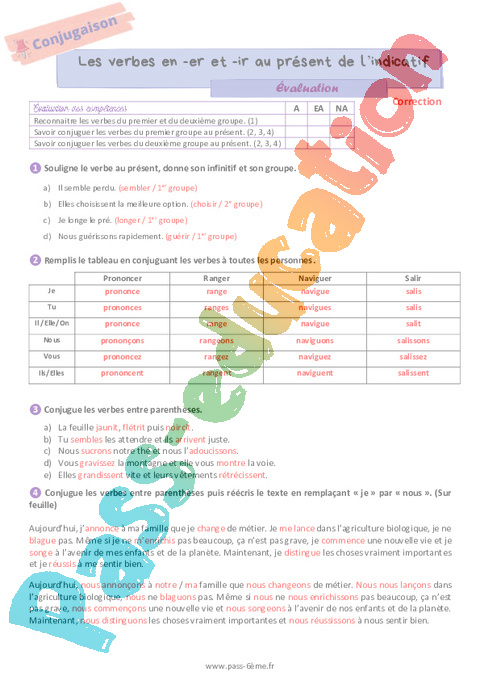 Correction Evaluation Les verbes en er et les verbes en ir au présent 6ème pdf