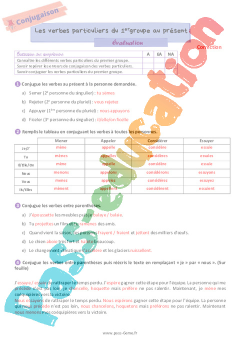 Correction Evaluation Les verbes particuliers du 1er groupe au présent 6ème pdf