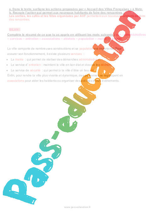 Complète le résumé de ce que tu as appris en utilisant les mots suivants : sûr – administratives – services – entretien – associations – déchets – population – mairie – sécurité.