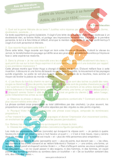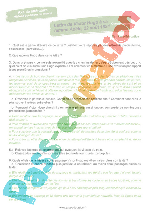 Correction Questionnaire : Secondaire 3 Lettre de Victor Hugo à sa femme Adèle pdf