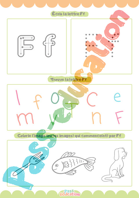 Une activité ludique pour apprendre à écrire la lettre F en majuscule et minuscule, reconnaître sa forme et la repérer dans un mot. Les enfants termineront en coloriant une image qui commence par F, pour renforcer l’apprentissage par le jeu.