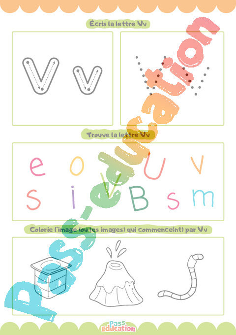 Une activité ludique pour apprendre à écrire la lettre V en majuscule et minuscule, reconnaître sa forme et la repérer dans un mot. Les enfants termineront en coloriant une image qui commence par V, pour renforcer l’apprentissage par le jeu.