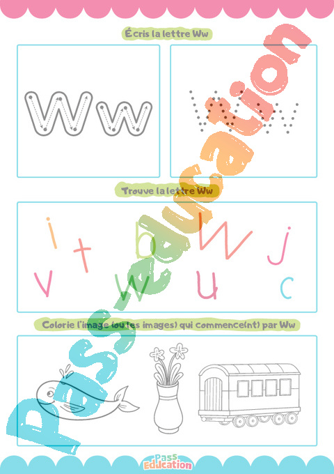 Une activité ludique pour apprendre à écrire la lettre W en majuscule et minuscule, reconnaître sa forme et la repérer dans un mot. Les enfants termineront en coloriant une image qui commence par W, pour renforcer l’apprentissage par le jeu.
