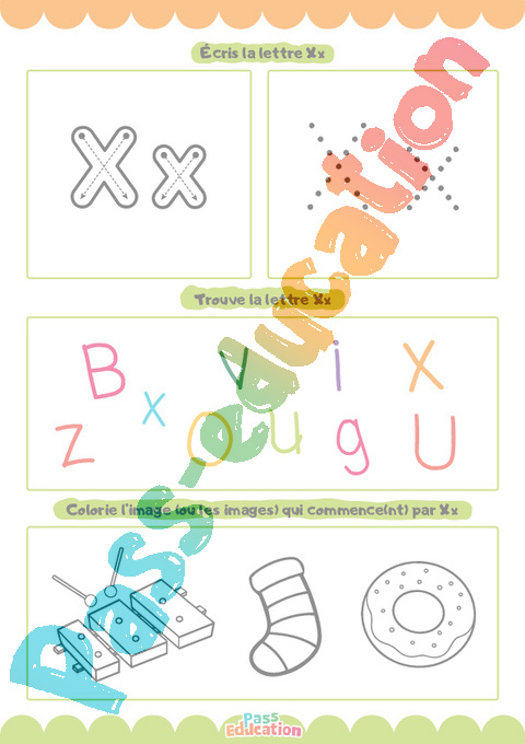 Une activité ludique pour apprendre à écrire la lettre X en majuscule et minuscule, reconnaître sa forme et la repérer dans un mot. Les enfants termineront en coloriant une image qui commence par X, pour renforcer l’apprentissage par le jeu.
