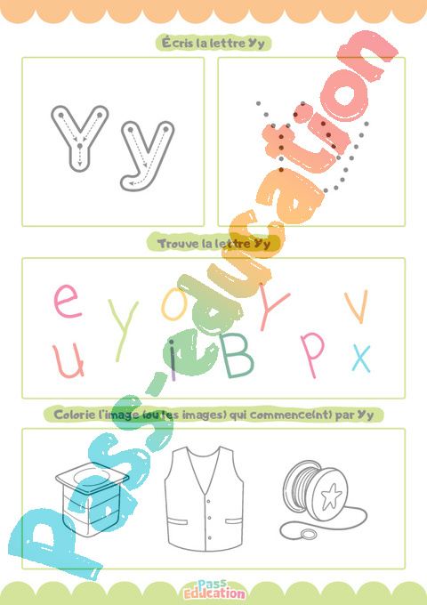 Une activité ludique pour apprendre à écrire la lettre Y en majuscule et minuscule, reconnaître sa forme et la repérer dans un mot. Les enfants termineront en coloriant une image qui commence par Y, pour renforcer l’apprentissage par le jeu.