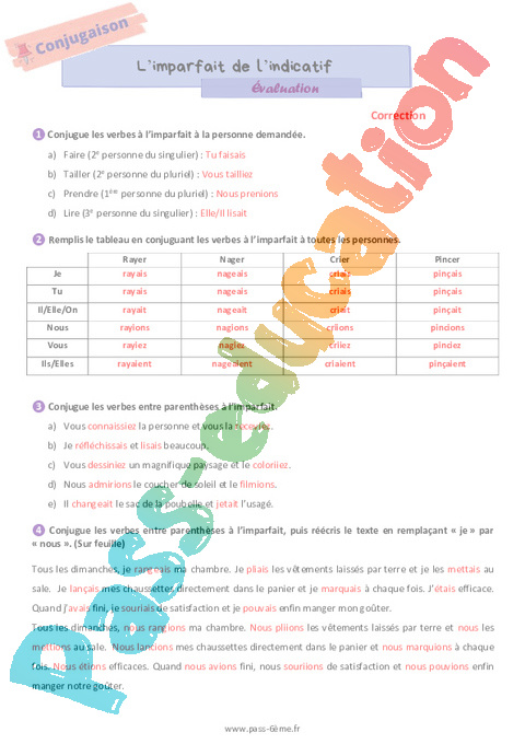 Évaluation de 6ème avec la correction sur l’imparfait de l’indicatif.