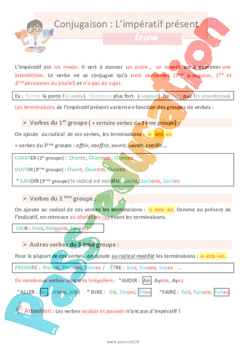 L’impératif est un mode. Il sert à donner un ordre , un conseil ou à exprimer une interdiction. Le verbe ne se conjugue qu’à trois personnes (2ème p.singulier, 1ère et 2èmepersonnes du pluriel) et n’a pas de sujet.