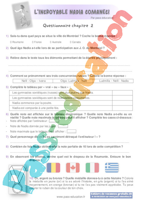 Questionnaire : Primaire 4, 5, 6 Chapitre 1 L’incroyable Nadia Comaneci pdf