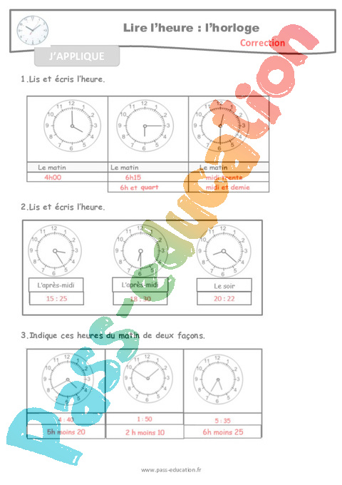 J’applique-Lire l’heure et l’horloge-CM-Décrochage scolaire-Correction pdf