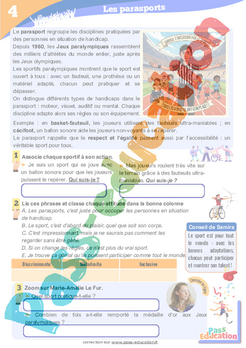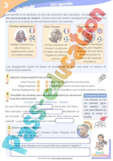 Fichier d’activités à imprimer sur la lutte contre la discrimination et le racisme dans le sport (EMC) pour la Primaire 4, 5 .