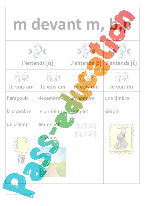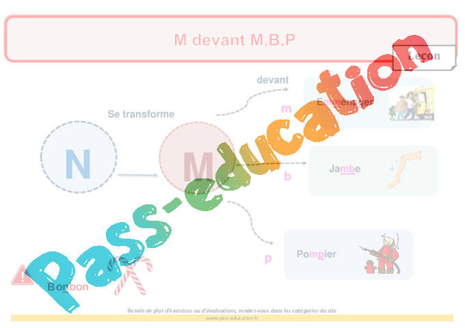 L’adulte explique : le son [an] [on] [en] et [in] s’écrit habituellement avec la voyelle suivie de la lettre N mais il y a des exceptions. En effet, devant les lettres M, B et P la lettre N se transforme en M.