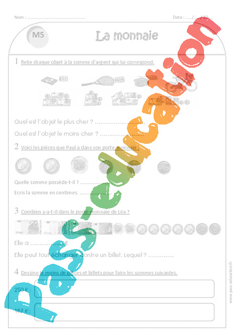 Monnaie : Primaire 2 – Exercices à imprimer rtf