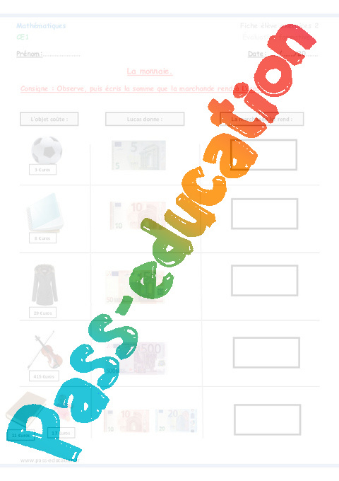 Exercices à imprimer pour la Primaire 2 sur la monnaie
