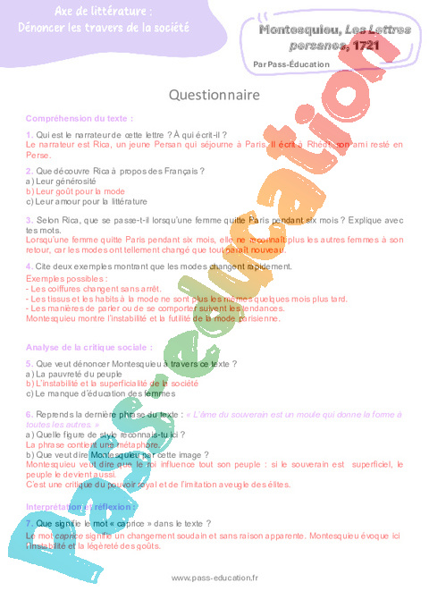 Correction Questionnaire Montesquieu, Les Lettres persanes, 1721 : Secondaire 3 pdf