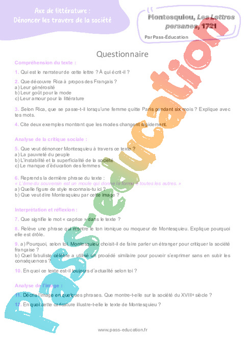 Questionnaire Montesquieu, Les Lettres persanes, 1721 : Secondaire 3 pdf