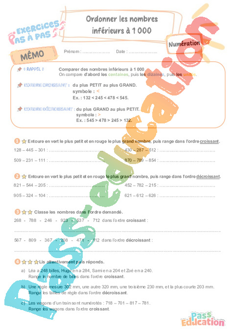 Ordonner les nombres inférieurs à 1 000 : Primaire 3 – Exercices Pas à Pas rtf