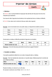 Cours sur organiser des données en 6ème. Définition: Un tableau est un outil permettant de regrouper des données afin de pouvoir les lire et les interpréter plus facilement. Il est souvent utile d’organiser des données en les représentant dans un tableau d’effectifs. L’effectif d’une valeur est le nombre de fois que cette valeur apparait. Exemple : Lors d’une élection dans une petite classe, on dépouille les bulletins suivants : Marie