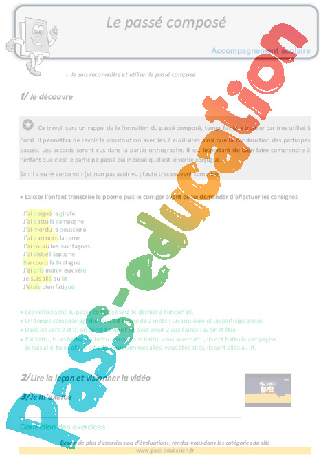Ce travail sera un rappel de la formation du passé composé, temps facile à trouver car très utilisé à l’oral. Il permettra de revoir la construction avec les 2 auxiliaires ainsi que la construction des participes passés. Les accords seront vus dans la partie orthographe. Il est important de bien faire comprendre à l’enfant que c’est le participe passé qui indique quel est le verbe conjugué.