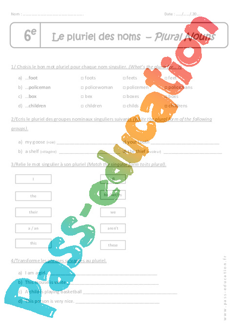 Plural Nouns – Pluriel des noms : Primaire 6 – Exercices corrigés pdf