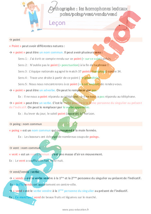Leçon – point-poing – vent-vends vend (Les homophones lexicaux) : Primaire 4 – Soutien scolaire pdf