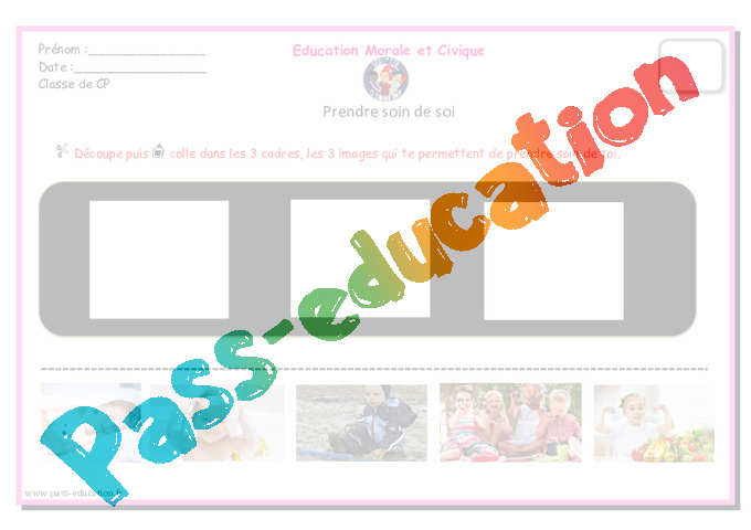 : Primaire 1 : Colle à l’intérieur des 3 cadres, les 3 images qui illustrent de quelle manière tu dois prendre soin de toi.