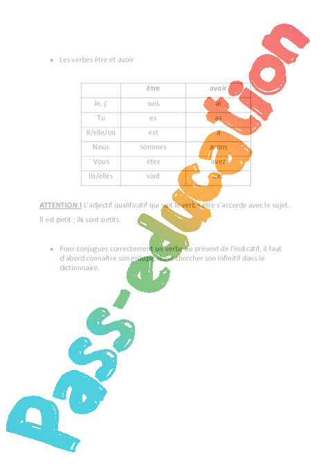 Cours de français Leçon de conjugaison : Primaire 4 : Le présent de l’indicatif, verbes du 1er et 2ème groupe (généralités) / verbes être et avoir.