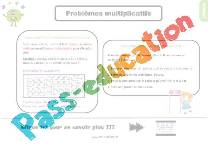 Exemple : Thomas achète 9 paquets de 4 gâteaux chacun. Combien a-t-il acheté de gâteaux ?