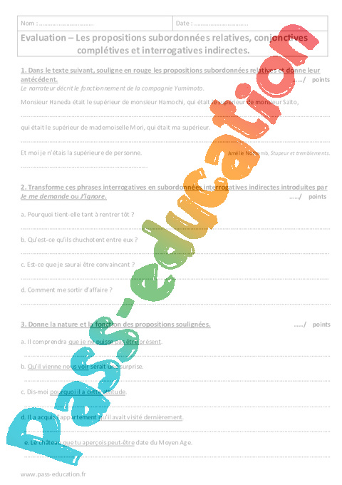 Propositions subordonnées : Secondaire 3 – Contrôle à imprimer pdf