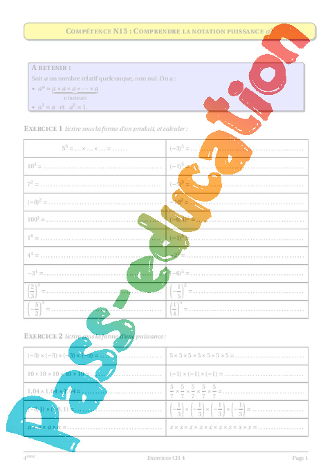 exercices -exposants négatifs : Secondaire 2