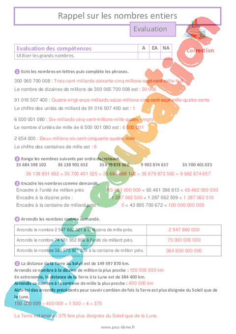 Correction évaluation Rappel sur les nombres entiers 6ème pdf