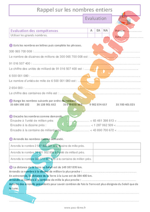 Evaluation Rappel sur les nombres entiers 6ème pdf