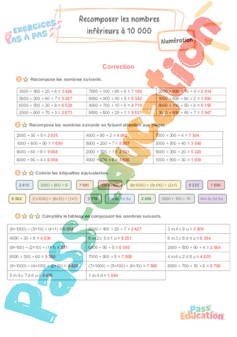 Correction Recomposer les nombres inférieurs à 10 000 : Primaire 3 – Exercices Pas à Pas rtf