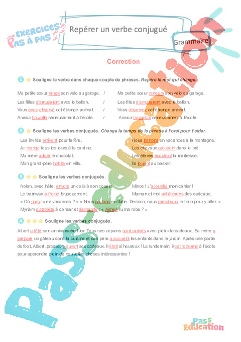 Correction Repérer un verbe conjugué : Primaire 3 – Mémo + Exercices Pas à Pas rtf