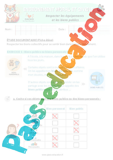 4. Correction- Fiche élève Respecter les équipements et les biens publics : Primaire 1 pdf