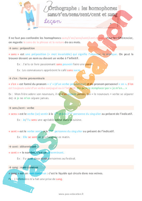 Leçon – Les homophones sans s’en sens sent cent sang : Primaire 4 – Soutien scolaire pdf