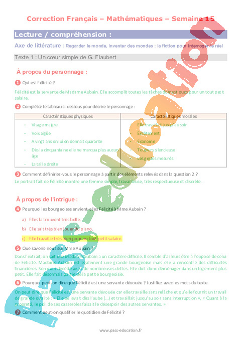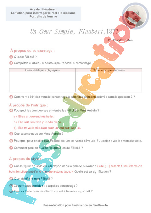 1b Questionnaire Un coeur simple – Flaubert semaine 15 IEF : Secondaire 2 pdf