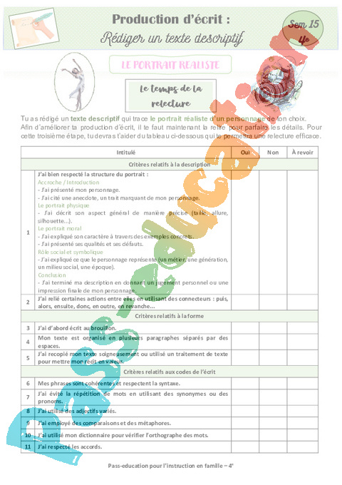 4 Expression écrite texte descriptif portrait relecture semaine 15 IEF : Secondaire 2 pdf