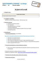 QUESTIONNER LE MONDE – Le temps – Fiche de préparation : Primaire 1 Fiche du maître Le jour et la nuit Objectifs visés : Se situer dans le temps Se repérer dans le temps et le mesurer Compétence spécifique : Identifier le caractère cyclique du temps : l’alternance jour / nuit Fiche de préparation de séquence pour mettre en place des séances d’apprentissage: Matériel nécessaire: Document et questionnaire élève. Pour l’expérience *une lampe de poche ou une bougie *une boule…