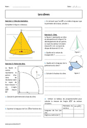 : Secondaire 2 – Exercices corrigés sur les cônes de révolution – Géométrie Exercice 1 : Cône de révolution. Compléter la figure ci-dessous. Exercice 2 : Patron de cône. La figure ci-contre représente le patron d’un cône de révolution dont le rayon de base mesure 4 cm. L’angle meure 90°. a. Calculer le périmètre de la base du cône. b. Exprimer la longueur de l’arc en fonction de x. c. En écrivant que l’arc a la même longueur que le…